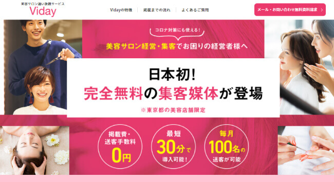 東京都内を中心に展開しています。美容院の他にエステ、マッサージ、ネイル、パーソナルジムなど5つのジャンル取り扱いがあります。Viday専用の限定メニュー(15~30分で満足してもらえるような特別メニュー)を提供し、ユーザーに試しでお店に足を運んでもらい、お店の雰囲気や良さを短時間で感じてもらえるような特別メニューを提供しています。