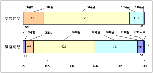上記のグラフを見てみると「9~10時間未満」が44.4%と最も多く、次いで「10~11時間未満」が42.1%となっています。営業時間の平均は9.4時間という結果になりました。店舗によっては10時間を超えるところもありますが、少しでも営業時間を長くして競合店と差をつけたいということが伺えます。