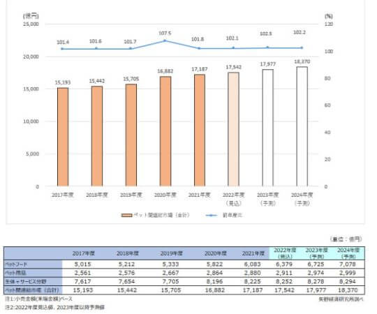 推移は急激な変化はないものの、穏やかな肩上がりで(予測も含め)市場は拡大傾向にあります。ペットに関連する健康志向への高まりによるフード関連、SNSによって「魅せる」ための美容サービス・ストレス緩和などのペットサロン、ペット関連製品(洋服)など、さまざまな業種の多様化が見受けられます。