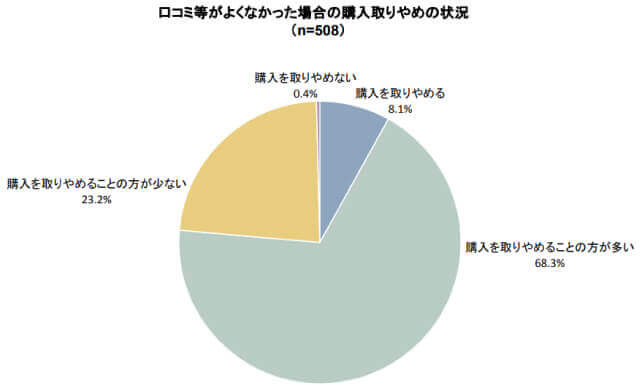また、「口コミ等がよくなかった場合の購入取りやめの状況」調査では、購入を取りやめることの方が多い68.3%、購入を取りやめることの方が少ない23.2%、購入を取りやめる8.1%、購入を取りやめない0.4%という結果があります。