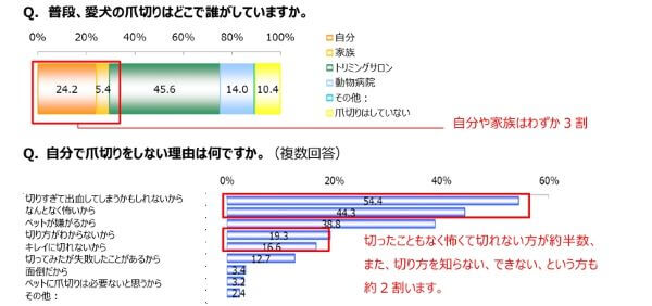 N&R合同会社のアンケート結果(下記の表)をみると、飼い主がペットの爪切りに対して「出血してしまうかも」「嫌がる」「キレイに切れない・切り方がわからない」などのお悩みを持っている飼い主が少なくありません。このような理由で、プロのトリマーなどに任せている方が多いのがわかります。